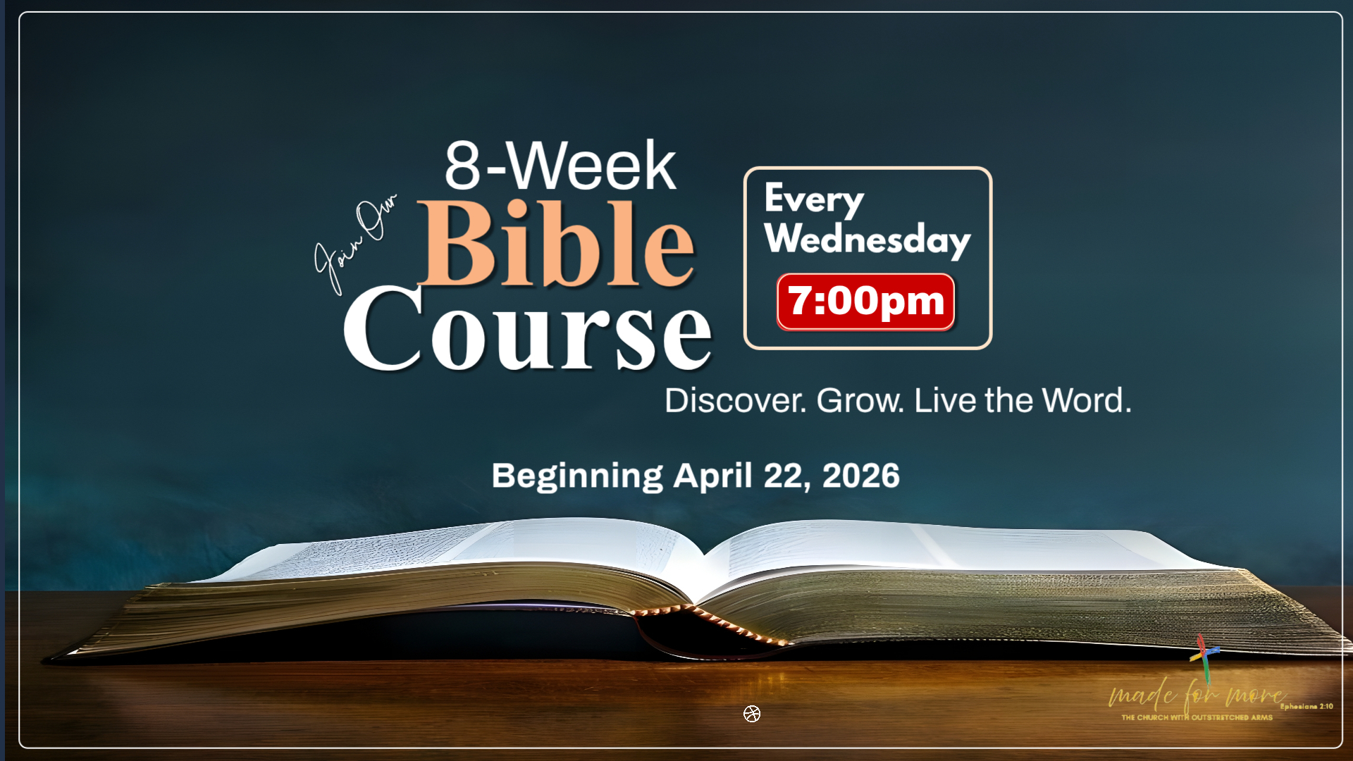 Join us beginning April 22, 2026, for our 8-week Bible Course! This is an opportunity to go deeper into God’s Word and grow in your faith. Be part of this transformative 8-week spiritual journey—you don’t want to miss it!